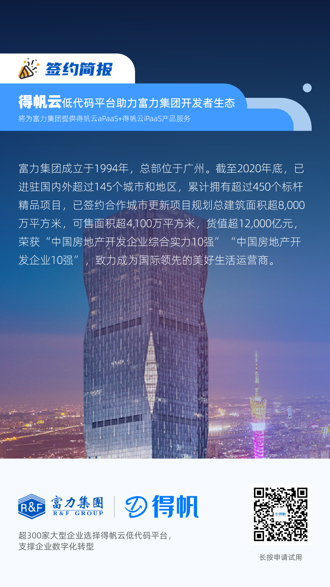 百强地产富力集团签约得帆云低代码平台,携手共建开发者生态